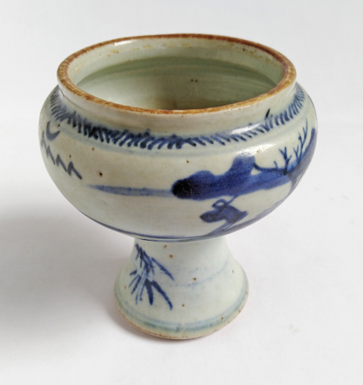 The rare blue and white stand water pot is hand-painted with Chinese landscape. It is in excellent condition except for a small peel off at the foot rim visible from the photo.